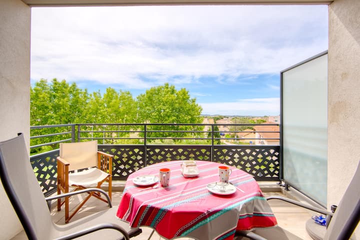 מרפסת עם נוף לבריכה ליד הנמל והמרכז