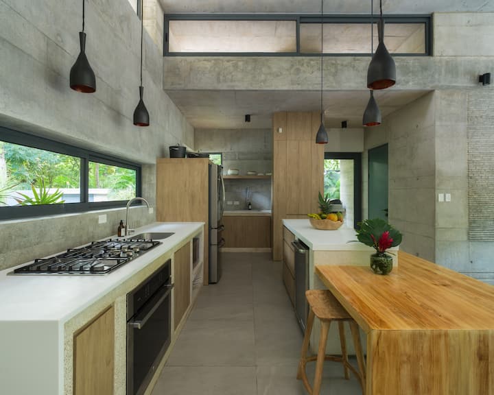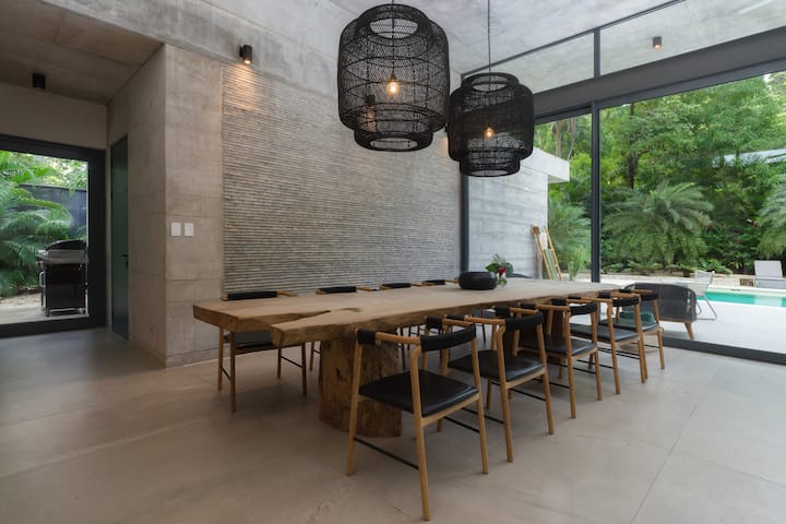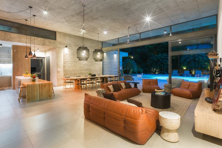 ניתן לפתוח את אזורי המגורים המרווחים לכיוון בריכת השחייה. הסלון הפנימי כולל מטבח מאובזר ומקומות ישיבה בבר על האי. פינת האוכל כוללת שולחן באורך 3 מטרים שמכיל בנוחות 10 אנשים. האורחים יכולים להירגע באזור הטרקלין הגדול והנוח מול טלוויזיה בגודל 60אינץ 'ולהשקיף לכיוון הבריכה והג'ונגל.