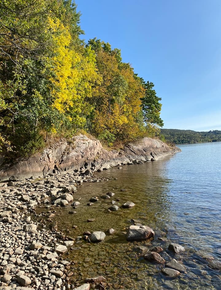 סלון צבוע באדום עם נוף לפיורד והרבה שמש.
