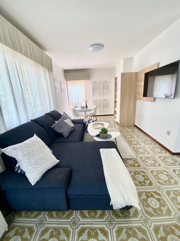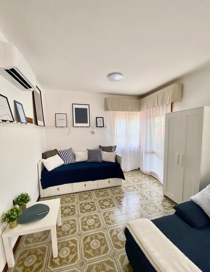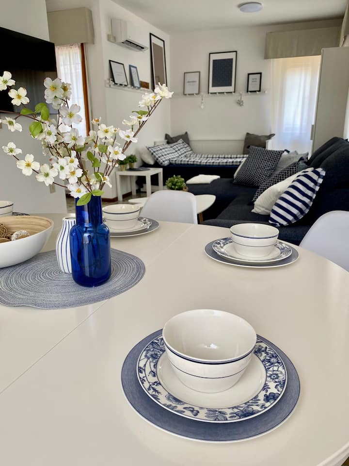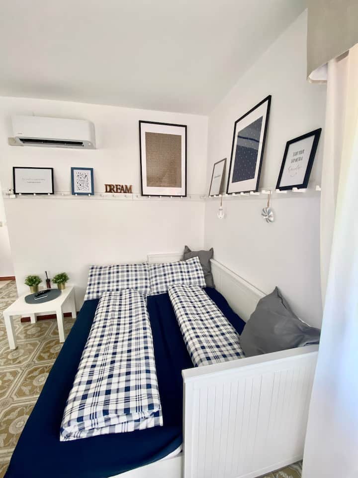 דירה לבנה בווילה כחולה ולבנה עם גינה