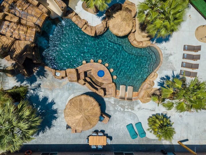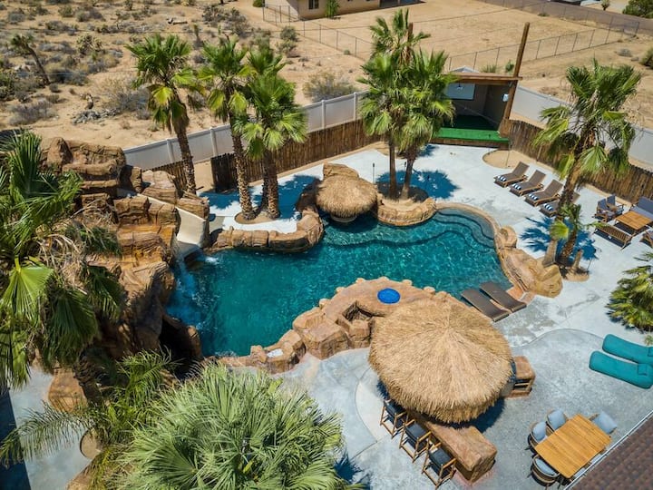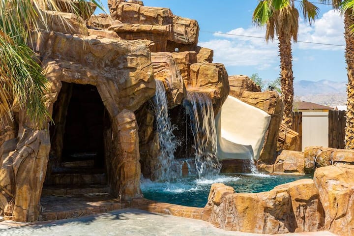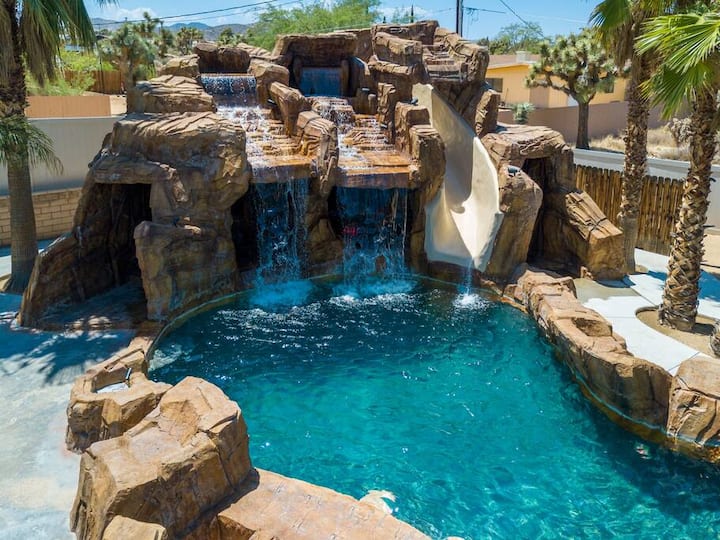ברוכים הבאים להרפתקה שלנו בארץ הפלאות של טיקי! מערה עם מפלים, מגלשת מים, ג'קוזי במערה נסתרת, בור אש ל -10 אנשים ושולחן מכוסה שמשייה בתוך הבריכה. השתמשו בבמה הגדולה שלנו עם מקרן כדי לצפות בסרט מתחת לכוכבים. ליהנות מהעיצוב של טיקי בוהו ולהרגיש כאילו אתם במלון מפואר. לטייל בפארק הלאומי ג'ושוע טרי או לאכול ארוחת צהריים ולהיות קאובויים בפיוניר טאון. אנחנו מבטיחים שברגע שתגיעו לבית הזה, לא תרצו לעזוב!