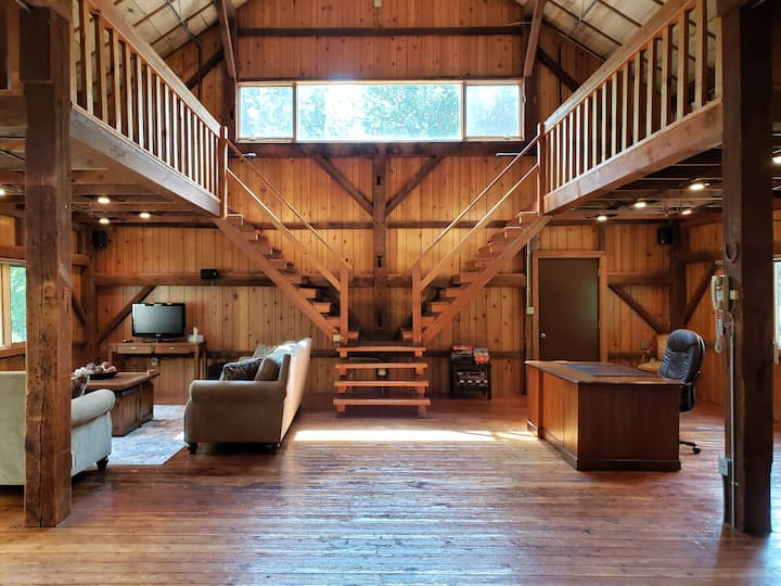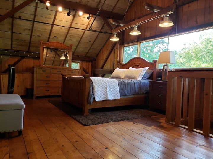 אסם הקונספט הפתוח שלנו כולל שלושה חדרי שינה בלופט המשקיפים על חלל מגורים משותף, מלאים בקורות חצובות ביד ורצפות עץ, כמו גם אזור חדר שינה במרתף. העיצוב הכפרי והנעים מגיע עם כל הנוחות המודרנית, כולל מיזוג אוויר מרכזי, רמקולי Bluetooth של סראונד סאונד ושתי טלוויזיות עם מסך שטוח עם Roku כדי שתוכלו להיכנס לחשבונות הסטרימינג האהובים עליכם. המטבח בגודל מלא שלנו מלא בכל מכשירי החשמל ואביזרי הבישול (למשל, כיריים, מיקרוגל, מקרר, מכונת קפה, מדיח כלים, סירים ומחבתות, כלי אוכל, סכו"ם) שאתם צריכים כדי לבשל ארוחה ביתית, או ליהנות ממשלוחים מהמסעדה המקומית האהובה עליכם.
