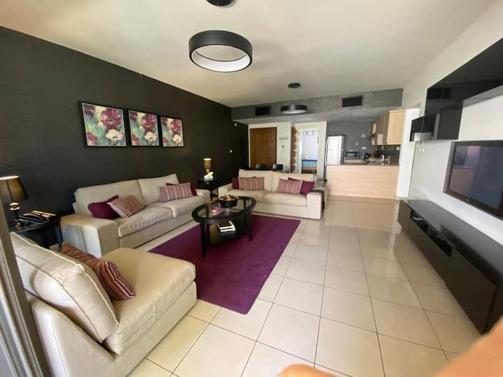 הסלון הוא אזור פתוח עם המטבח והמרפסת החיצונית, ספות ישיבה נוחות, טלוויזיה חכמה עם ערוצי לוויין זמינה, נתב Wi-Fi בחינם זמין גם כן.