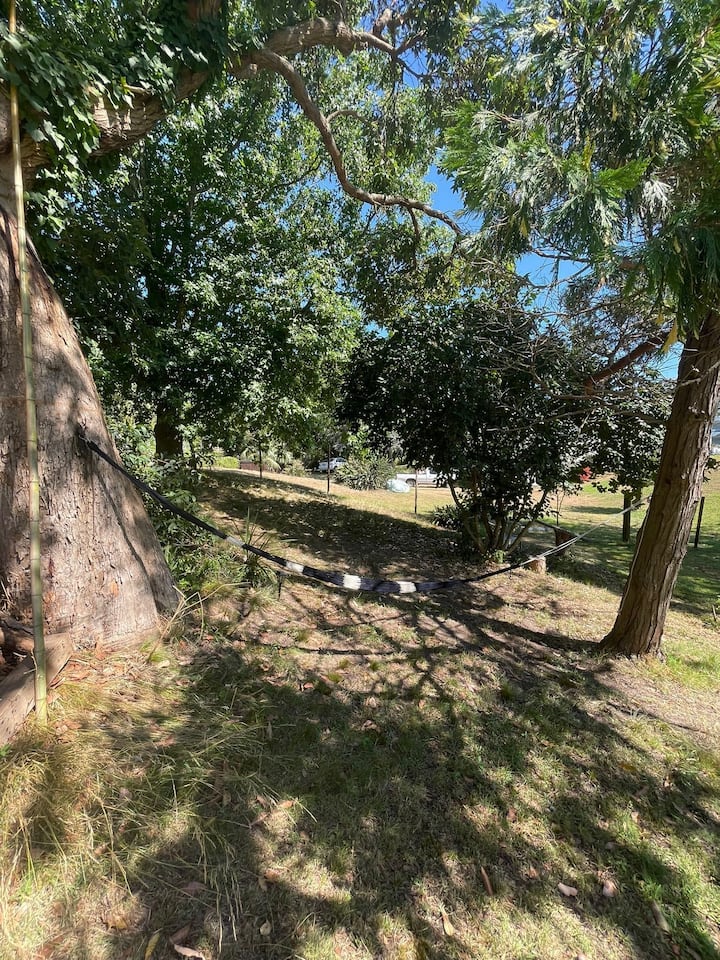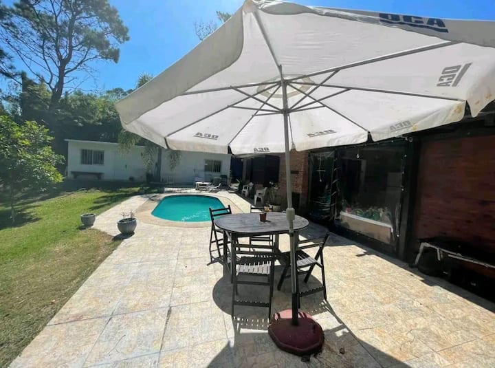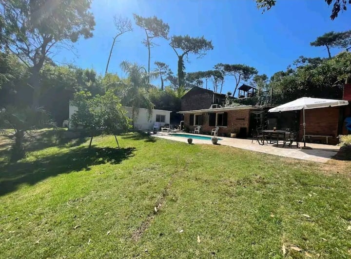 בית יפה עם בריכת שחייה ביערות אורן במרחק חצי רחוב מחוף הים עם מתחם גריל מקורה.