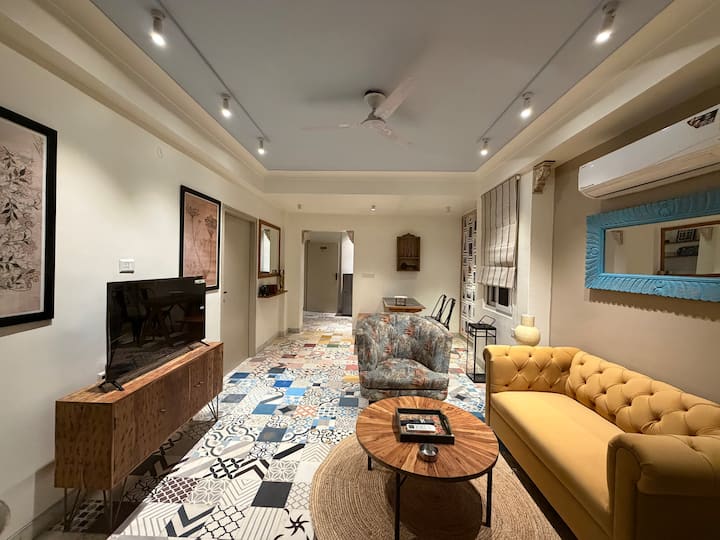 דירה אופנתית בהשראת רטרו משלבת נוחות וסגנון מודרניים, ומציעה את האיזון המושלם של יצירתיות ורוגע לשהייה שלכם בג'איפור.