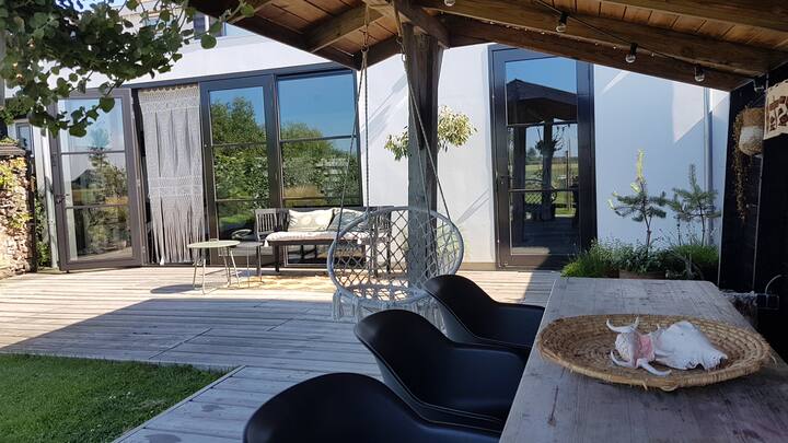 Samen met onze dochters wonen we in een fijn huis, net buiten het dorp, vlakbij bos en zee. Elke dag genieten we van de prachtige uitzichten, van steeds wisselende luchten en de akkers. We vinden het leuk om het huis tot een gezellige mooie plek te maken waar gasten zich thuis voelen. Zelf gaan we ook graag op pad, in natuur of stad. Wie weet tot ziens!