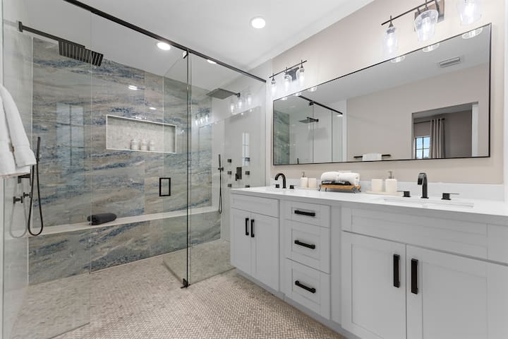 אפשר להירגע כאן עם מקלחת עם ראש גשם וג'קוזי.