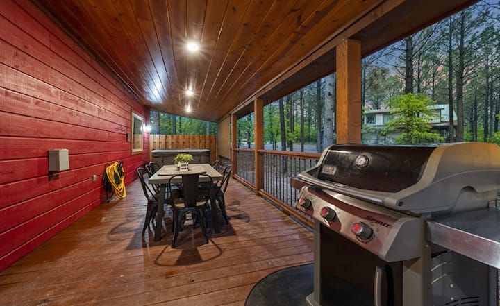 למעלה, אזור הלופט הרחב מבטיח בידור אינסופי, ואילו שולחן האוכל מכיל בנוחות שישה מקומות ישיבה, עם מקומות ישיבה נוספים זמינים באי המטבח. צאו החוצה אל הדק, שם ממתינים אח פצפוצים, טלוויזיה, ג'קוזי, ריהוט נוח וקורנהול. עם רדת הלילה, החצר מתעוררת לחיים עם אורות מחרוזת מנצנצים, מטילה זוהר קסום על אזור בור האש, שם כיסאות אדירונדק מזמינים סיפורי אח או רגעים עצלים בערסל.