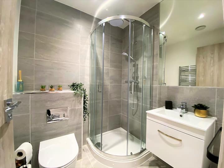 חדר הרחצה האלגנטי והמודרני כולל מקלחון רבעי, שירותים וכיור.