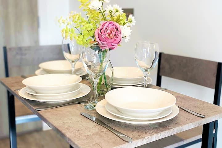 לבשל, להירגע ולהירגע בלב הדירה. המטבח המודרני מצויד בתנור, כיריים, מיקרוגל, מקרר-מקפיא, מכונת כביסה, טוסטר, קומקום וכל כלי הבישול החיוניים. אנחנו גם מספקים תה, קפה וסוכר בחינם כדי להתחיל את הבקרים שלכם כמו שצריך!