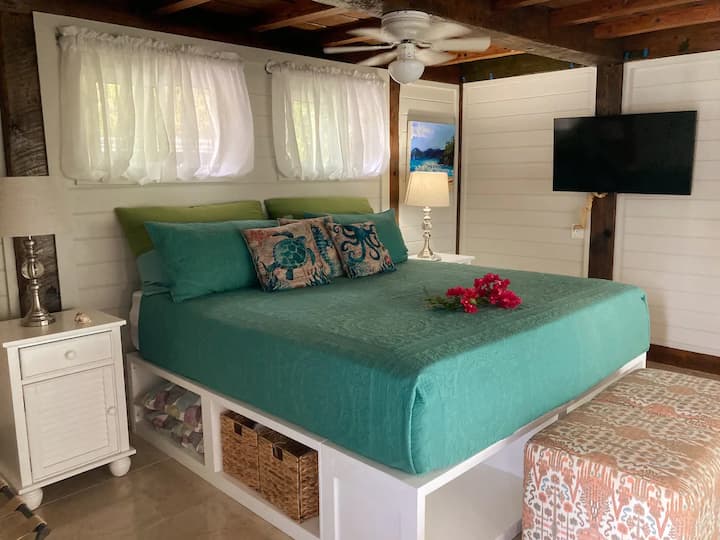 יצרנית ארונות מקומית, אדוניס וולטרס, עיצבה ועיצבה את ארונות המטבח וחדר הרחצה, כמו גם את מיטת הפלטפורמה התומכת במזרן קינג יוקרתי חדש. להירדם מתחת לסדיני סיבים טבעיים מגניבים אחרי היום שלכם ולחקור את האי הטרופי היפהפה הזה. בסטודיו יש מיזוג אוויר זמין, אם כי בגלל הרוח הקבועה והטמפרטורות המתונות זה נדיר. בבוקר תיהנו להשתרע על מיטת הקינג סייז הנוחה ולהביט על הר בורדו והעמק למטה, או לקחת את הקפה שלכם למרפסת וליהנות מצפייה בקורל ביי.