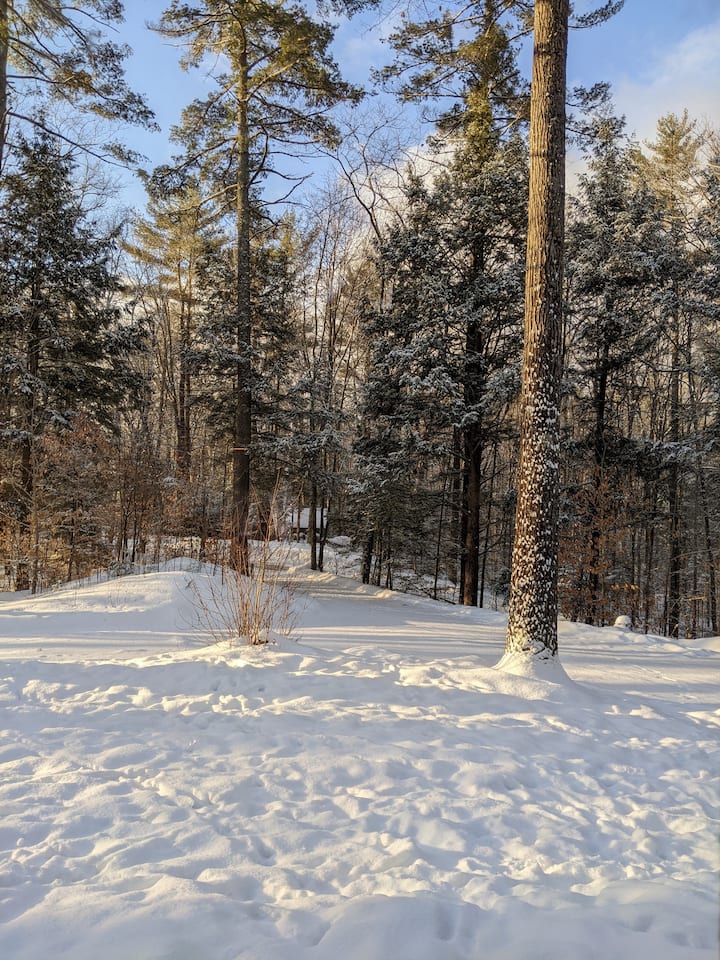 קילומטר וחצי במורד דרך העפר שלנו, מעבר לאגם השכונתי, חבוי במורד שביל הגישה הארוך שלנו... תגיעו לבקתה הקטנה שלנו השוכנת על 1.3 אקרים מיוערים; מציעה שקט ופרטיות אולטימטיביים.