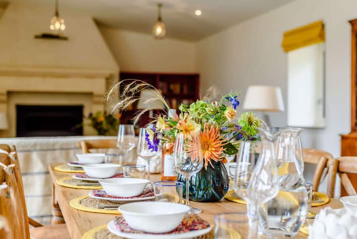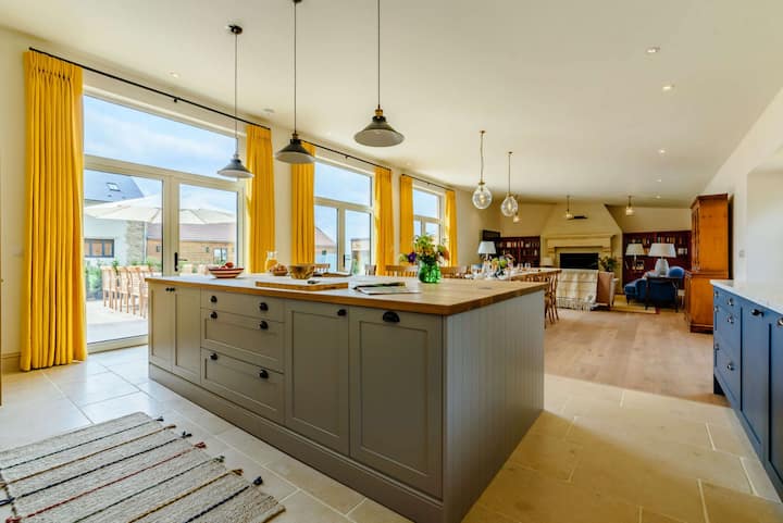 חלל מגורים פתוח ומעודן שעוצב מתוך מחשבה על התרועעות. מאפייני התווים כוללים חלונות בגובה מלא המציפים את החלל באור טבעי ותקרות קמורות גבוהות עם קורות עץ חשופות. השירותים לאורח כוללים 2 תנורים חשמליים של בוש, כיריים גז 5 מבער עם מבער ווק, מיקרוגל, 2 x מדיחי כלים, מקרר משקאות גדול, ברז מים רותחים של Quooker, מכונת קפה נספרסו עם אספקה ראשונית של תרמילים, טוסטר וקומקום. בתוך המזווה יש מכונת כביסה, מייבש כביסה, מקפיא בסגנון אמריקאי עם מכונת קרח ומתקן מים מסוננים מצוננים, מדפים לאחסון מזון, ארון מזווה וכיור. במרכז החדר יש שולחן אוכל ארוך עם 12 מקומות ישיבה נוחים. יש יציאות USB ושקעי תקע המסופקים מתחת לשולחן האוכל, אידיאלי לעבודה בבית ולשהיות של חברות. בקצה השני של החדר נמצא הסלון הראשי עם שלושה ספות עם ארבעה מושבים, Jetmaster open fire, Smart TV, Sonos sound bar, מבחר ספרים ומשחקי לוח. שלושה סטים של דלתות צרפתיות נפתחות למרפסת השלווה ולגן הנוף שמעבר.