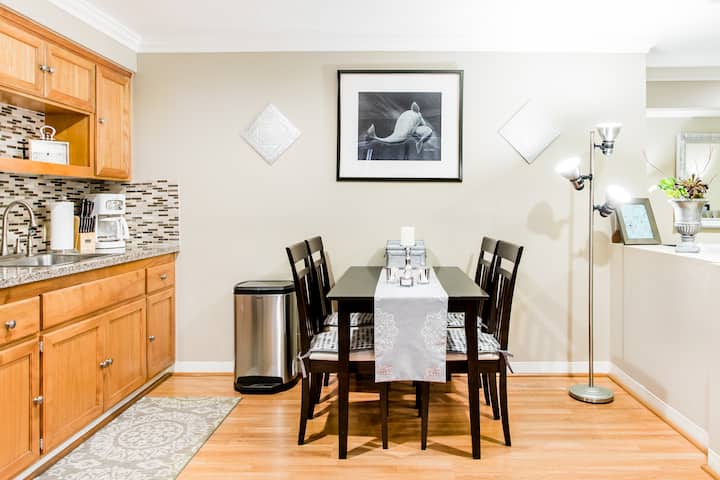 יש חדר רחצה מלא חדש לגמרי עם משטחי גרניט, מגבות יוקרתיות וארון גדול. מטבח חדש לגמרי עם מכשירי חשמל מנירוסטה ומצויד במלואו לשהייה שלכם. יש פינת אוכל, טלוויזיה HD ואינטרנט מהיר/Wi - Fi. יצירות אמנות יפהפיות ורהיטים חדשים ממוקמים בכל חלל הפנים. הנכס כולל פטיו פרטי ומקורה מאוד עם נברשת, יחד עם חניה פרטית שמורה 5 צעדים מהכניסה. יש מיזוג אוויר וחימום צמודים. חדר הארונות משמש גם כחדר ילדים קטן - יש חלון לבחוץ בכניסה. מתאים למיטה הנפתחת התאומה שלנו או את ה - pack'n'playשלנו - שניהם זמינים עבורכם.