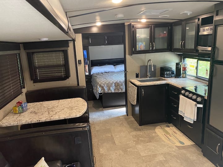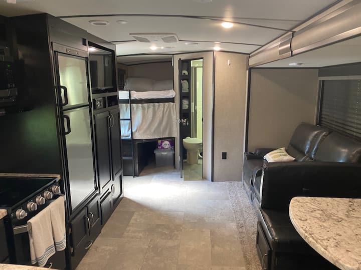 להירגע לסוף השבוע בקרוואן של ממות 'קייב - הקרוואן עצמו מכיל חדר שינה ראשי בליווי מזרן קווין סייז (דלת מגלשה לפרטיות). מעבר לדלת הזו שוכן מטבח שמצויד בתנור, כיריים, מיקרוגל, כיור, מקרר ומקפיא ושפע של מקום אחסון. בארונות ובמגירות האלה תמצאו קקאו, קפה, כלים, צלחות, כל מה שתצטרכו למטרות האוכל שלכם. כמו כן, חלק מהמטבח כולל שולחן בסגנון תא שנפתח למיטה לילדים. הסלון מרוהט בשני כורסאות שמסוגלות לחימום ועיסוי אחרי יום רב - אירועים באגם או במערות. בחלק האחורי של הבית הצנוע יש שתי מיטות קומתיים נוחות ומרווחות מספיק לשני מבוגרים לכל מיטה. באזור זה יש חדר רחצה עם כיור, מקלחת ושירותים. לא יהיו בתי מרחץ לחניכים שלנו! עם זאת, החלק הפנימי הוא רק ההתחלה - הקסם האמיתי מתרחש במדורה ממש בחוץ. דשא טוב כמו כריות שטיח, הבהונות ומרכך את השביל לבור האש היפה שלכם, מוקף בכיסאות אדירונדאק נוחים מעץ! גריל ומיני מקרר נגישים לשימושכם, אם אתם מעדיפים לבשל בחוץ וליהנות משאר היום. אין צורך להיכנס ולצאת מהקרוואן למשקה הקר או לאוכל מבושל. יחידה זו מצוידת גם במכשירי חשמל בחוץ. אנחנו מפצירים בכם לנסות את ארוחות הערב שלנו - שולחן פיקניק מואר במצב רוח עם משקל של ארוחות טעימות וצחוק לבבי. שם תוכלו להשליך את סיפורי הדגים המוגזמים שלכם או להמחיש את הגלים העצומים שפגעו בהם בזמן שייט אבובים!
