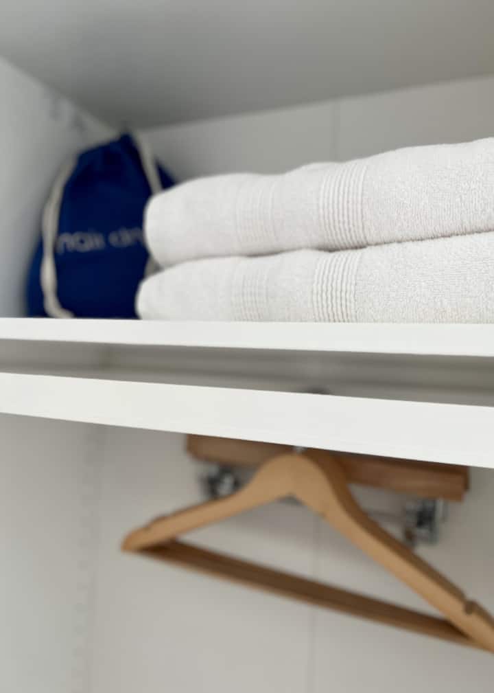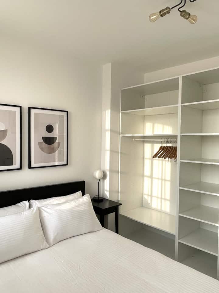 חדר השינה כולל חלל אחסון ומיטה נוחה של מצעי כותנה לבנים.