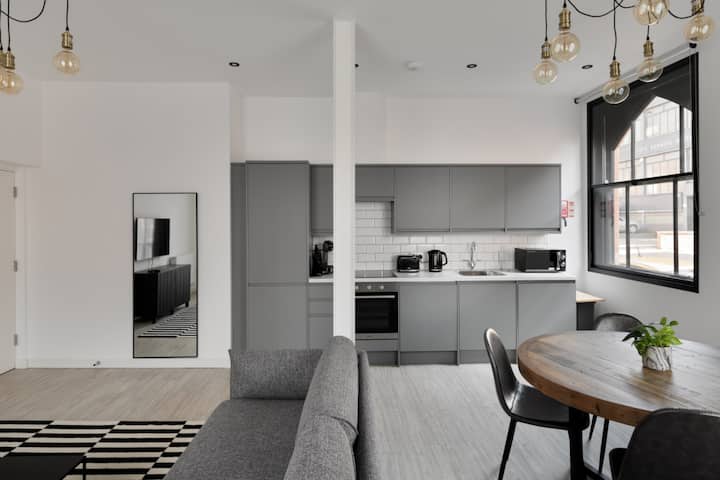 דירה ייחודית זו נמצאת בבניין היסטורי רשום מדרגה II ברובע התכשיטים של בירמינגהם. יש לו עיצוב מינימליסטי מודרני, אבל הוא נשאר חמים ומלא אופי.