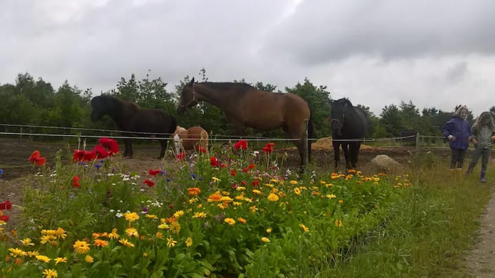 אנחנו גרים בכפר אורגני בדנמרק במרחק שעה מקופנהגן. כאן אנחנו גרים יחד עם אנשים אחרים, קרוב לטבע ועם הרבה בעלי חיים סביבנו.
