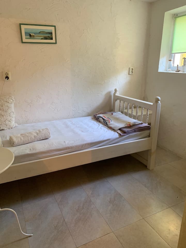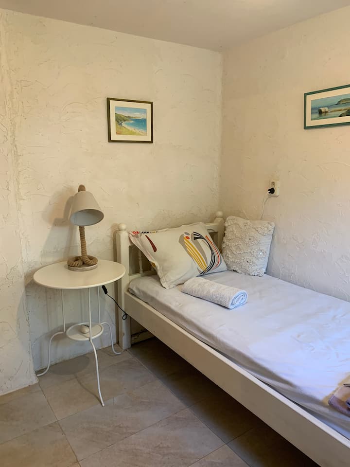 חדר ליחיד עם גינה ונוף לים.