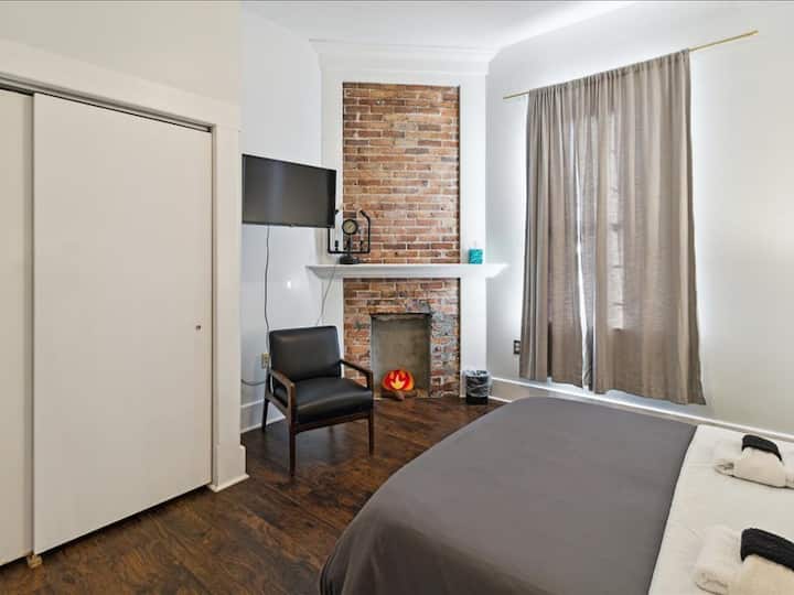 השינה של ★★השגרירות הוא חדר שינה פרטי עם אח לבנים דקורטיבית (ללא שריפות), מיטת קווין סייז נוחה עם מזרן ספוג, סדינים רכים, פרימיום, והרבה שירותים לאורח לשהייה רגועה בעת ביקור במרכז העיר ההיסטורי של סוואנה.