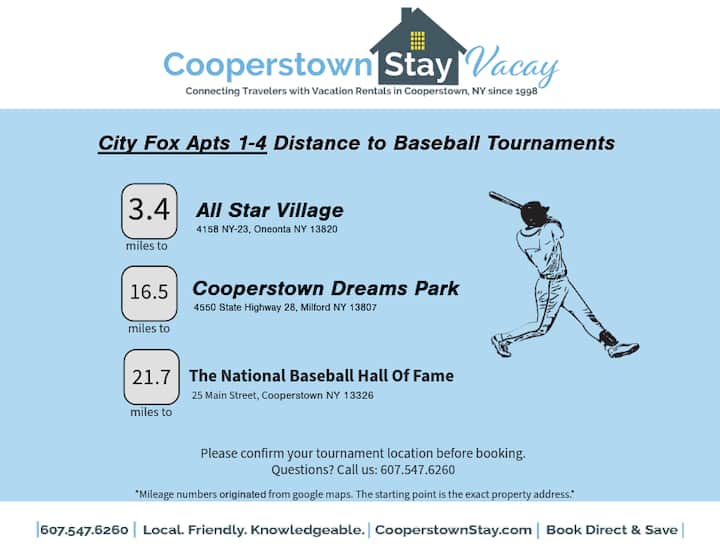 נשמח לעזור; Cooperstown Stay Vacay מחברת בין מטיילים כלליים להשכרת בתי נופש בקופרסטאון, ניו יורק והסביבה. אנחנו מציעים מגוון רחב של אפשרויות לינה; דירות פרטיות, בתים פרטיים, סביבה כפרית, חופשות על שפת המים ועוד! צוות Cooperstown Stay Vacay הוא מקומי, בעל ידע וידידותי מאוד. כולנו מקומיים בקופרסטאון, מגדלים את המשפחות שלנו וחיים את חיינו בקופרסטאון. זה מספק לנו רמה ללא תחרות של ידע מקומי מקצועי – כדי לעזור לשרת אתכם. שירות הלקוחות נמצא בראש סדר העדיפויות שלנו. אפשר להתקשר אלינו או לשלוח לנו אימייל עם כל שאלה. אנחנו מכירים היטב את כל הנכסים שלנו ואת האזור, אנחנו יכולים לעזור לכם למצוא את דירת הנופש המושלמת הזו לצרכים שלכם.