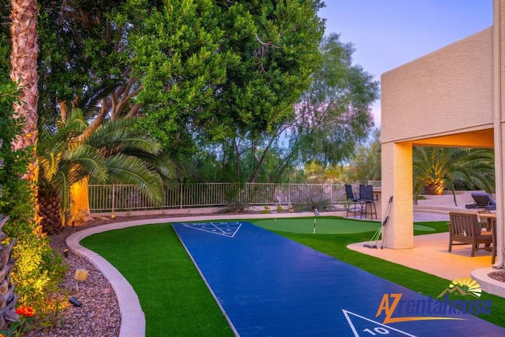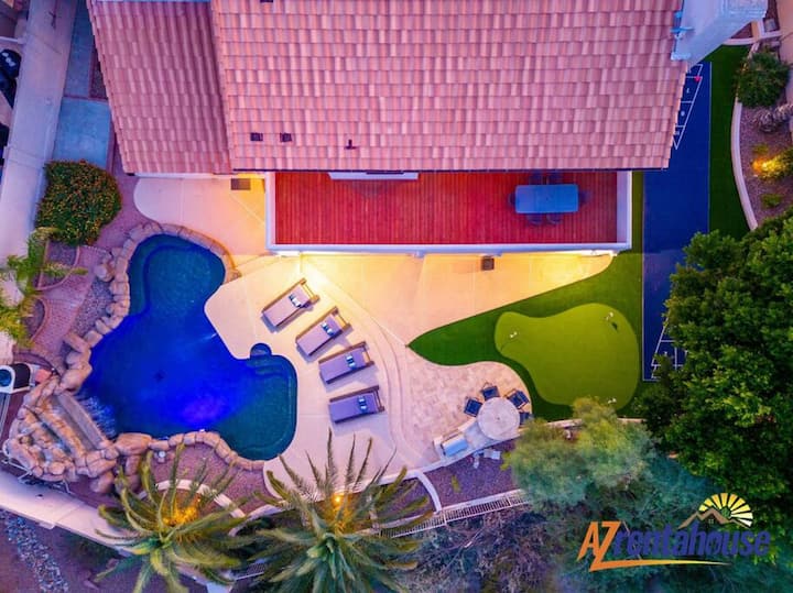 אחרי יום סיור ארוך – תירגעו בגן עדן הפרטי שלכם. לנצל את מזג האוויר היפה של אריזונה וליהנות ממנו בפרטיות! אמבטיית שמש על אחד מכיסאות הטרקלין הנוחים, להתקרר בבריכה הנוצצת, להירגע בספא המחומם, לצלות מרשמלו על בור האש ועוד הרבה יותר! המרפסת המקורה הגדולה מספקת שפע של מקומות ישיבה, מנגל בחוץ, עם שלושה אזורי מגורים ונווה מדבר בחצר האחורית עם בריכה מחוממת.(בעלות נוספת) נווה המדבר הפרטי שלכם בחצר האחורית כולל פטיו מקורה ומספר שולחנות שבהם אפשר לסעוד אלפרסקו.