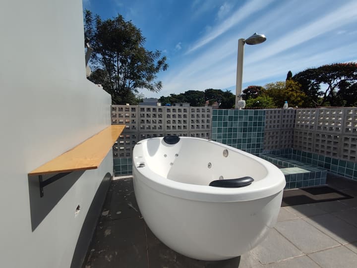 אפשר להירגע כאן עם מקלחת חיצונית וג'קוזי.