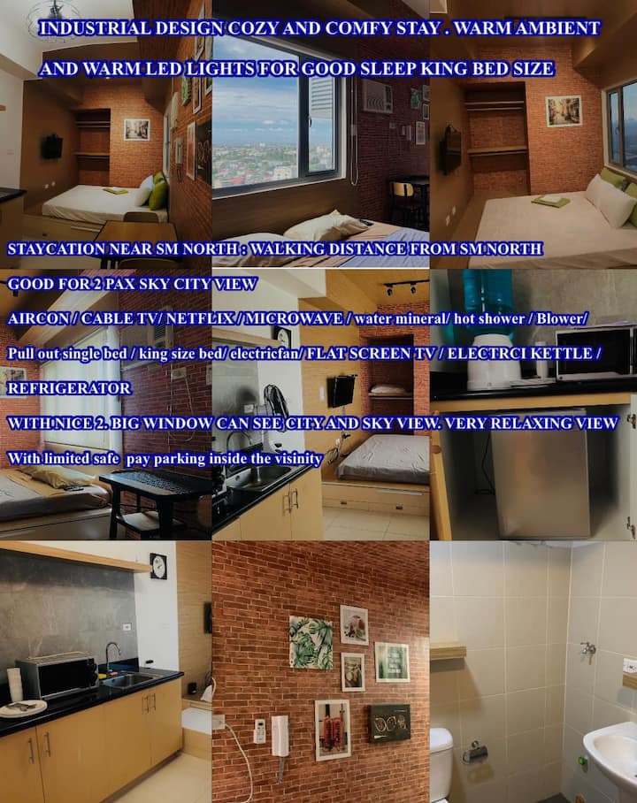 חופשה ביתית/שהייה נוחה ונעימה עם חדר מיזוג אוויר, נטפליקס, אינטרנט, טלוויזיה בכבלים, מיקרוגל, רפלקס, דוד מים, דוד מים, ביצי קפה וכו ', חלונות גדולים הפונים לחזית העיר עם נוף למנילה. עם תריסים על החלון לפרטיותם . מושלם לשהייה רגועה ונוף יפה, יחידה חדשה. דירת 5 כוכבים. מרחק הליכה מ - sm North.