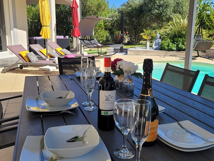 Piscine au sel, terrain de pétanque privé, cuisine d'été, jardin fleuri, salon de jardin , 100m2 de terrasse couverte. Repas sous pergola.