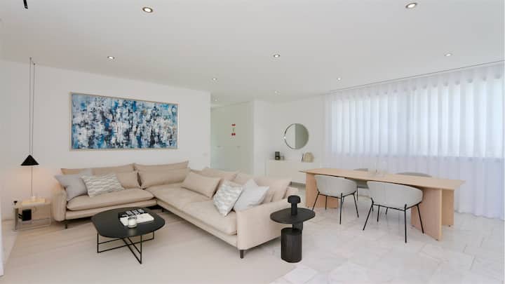 A sala de estar com o acesso à cozinha em estilo “open space” foi pensado para proporcionar aos hóspedes momentos de convívio. É composta por um sofá chaise-longue, Smart TV com Netflix e Sky Sports, canais generalistas de diversos paises (inglês, francês, espanhol, russo, português, entre outros países). Banda larga de fibra de alta velocidade e WiFi. O espaço de refeições é composto por mesa quadrada e 8 cadeiras. Próximo da sala de estar temos uma casa de banho de serviço
