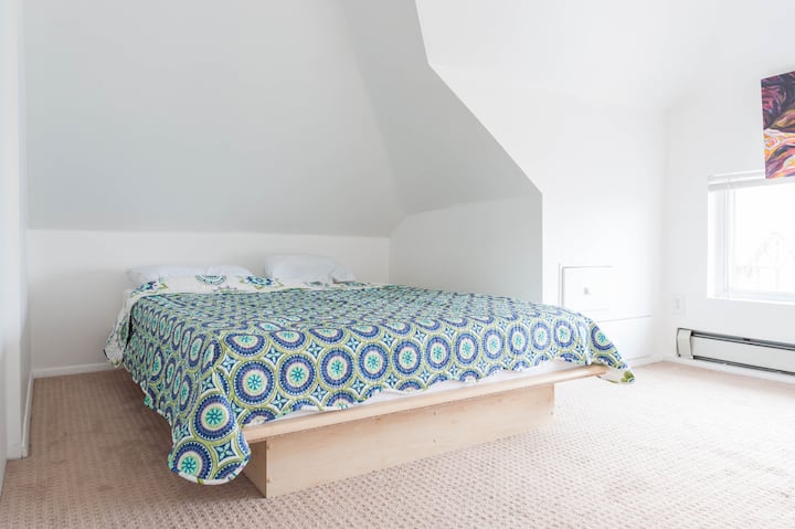 1 מיטה זוגית רחבה, 1 ספה, 2 מזרונים על הרצפה