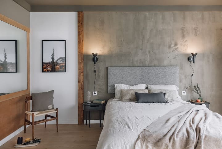 בדירה יש 2 חדרי שינה כפולים עם מיטות קווין סייז נוחות וחדר שינה יחיד אחד. בחדר השינה הראשי יש חדר רחצה צמוד עם מקלחת ואזור עבודה עם תחנת עבודה ייעודית. בחדרי השינה האחרים יש שפע של שטח אחסון ואלמנטים עיצוביים חמימים בהשראת הרים. בחדר הרחצה השני יש אמבטיה מרגיעה, וחדר הרחצה השלישי מבטיח שהאורחים לעולם לא יצטרכו לחכות לתור שלהם.