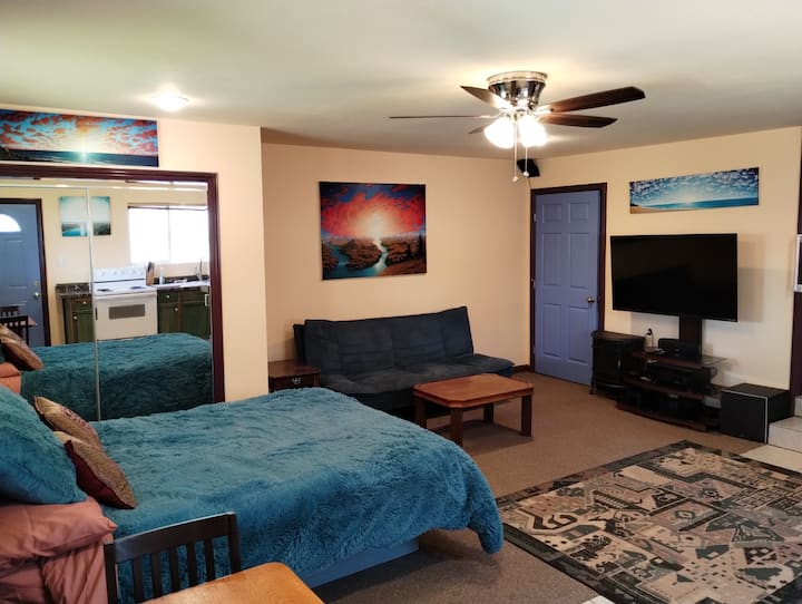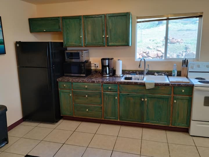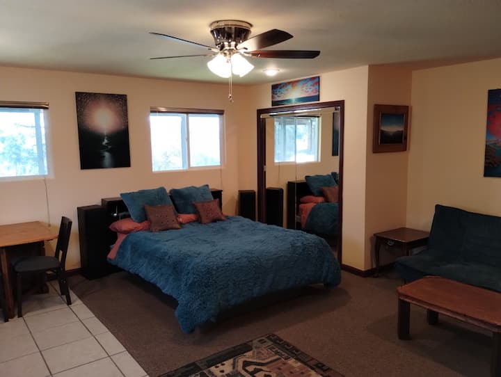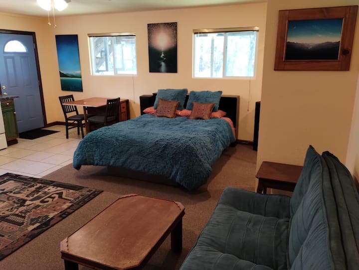 כשאתם נכנסים לראשונה למרחב, המשובצים שלכם בצבעים היפים וביצירות האמנות המקוריות. זה נעים במיטבו. יש מיטת קווין סייז רכה ונפלאה עם כרית מזרן מחוממת שתוכלו ליהנות ממנה כשאתם צופים בסרטים בטלוויזיה עם מסך שטוח 60 אינץ' עם מערכת סאונד היקפית מדהימה. יש שפע של מקום לחפצים שלכם בארון דלת ההזזה של המראה עם שידה מלאה בפנים. יש סלון קטן עם ספת פוטון מתקפלת שיכולה להכיל שני אורחים נוספים. המטבח מצויד במלואו עם כלי בישול, כלים וכלי אוכל. לארוחות אלגנטיות יש לנו שולחן עץ אלון מתקפל וינטג' שיכול להכיל ארבעה אנשים או יותר. בחדר הרחצה בסגנון ארט דקו יש תחושה עתידנית עתיקה. עם מקלחת עגולה שתשגר אתכם למעלה. יש מרפסת שמש מקסימה במעלה המדרגות עם נוף מדהים לטבע של העמק למטה ואזור Tepee הקסום שלנו.