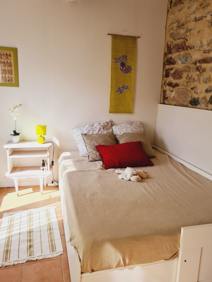 3/ מצעים: אנחנו יכולים להכין לכם מכונה (€ 5) או שתוכלו ללכת למכבסה בכניסה לכפר. האלונקה זמינה בגינה.