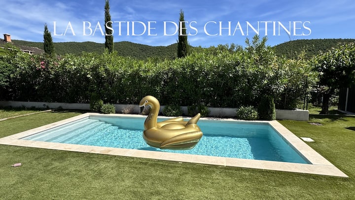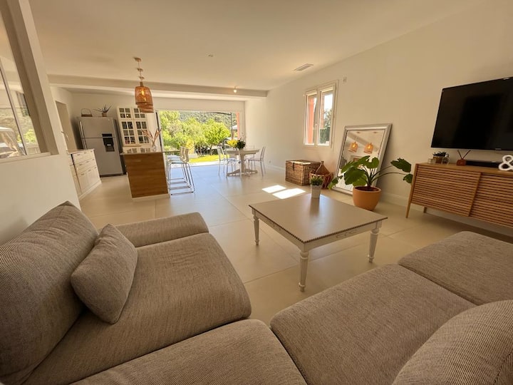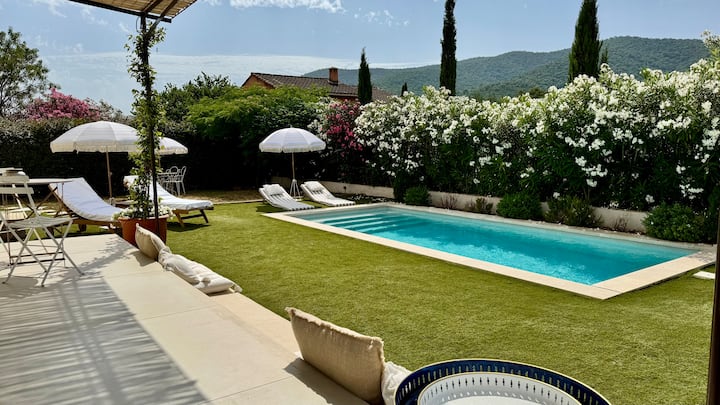 בית כפרי ובריכת שחייה מחוממת בין כרמים וחופים