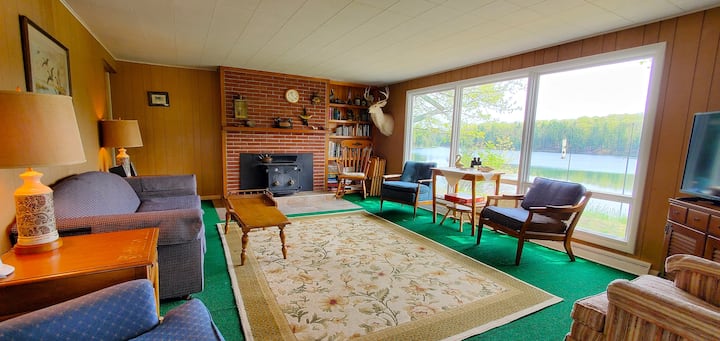 בפנים, העיצוב הוא וינטג' ומציע לאורחים את הדברים החיוניים הבסיסיים. הבית יכול להלין 4 אורחים בין שני חדרי שינה בגודל נוח. בחדר השינה הראשי יש מיטה זוגית, שידה וארון. בחדר השינה השני יש שתי מיטות זוגיות, שני שידות וארון. בסלון יש ספה נפתחת וחלון התמונה הגדול מאפשר הרבה אור עם נוף מדהים לאגם. במטבח יש את כל מה שצריך כדי להכין שלוש ארוחות מלאות, בתוספת כלי הגשה נוספים לחגים וגריל פרופן בחוץ. חדר האוכל מושב חמישה, ובנוסף יש מקומות ישיבה נוספים במרפסת שלוש העונות. יש טלוויזיה חכמה, ספרים, משחקים ונגן DVD.