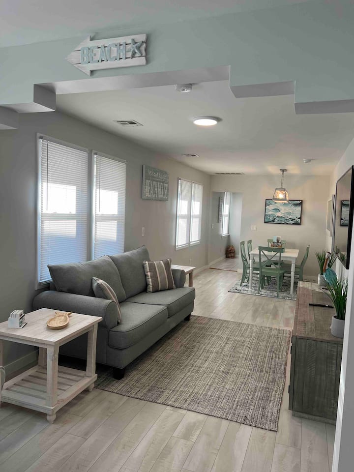 • בסלון יש ספה עם 2 שולחנות קצה ושתי כורסאות עם שולחן ביניהם. להירגע על הספה ולצפות בכל התוכניות המועדפות עליכם בטלוויזיה חכמה בגודל 75אינץ '(התחברו עם חשבון סטרימינג משלכם). תמצאו את תגי החוף ואת אישור החניה על השולחן בין שתי הכורסאות.