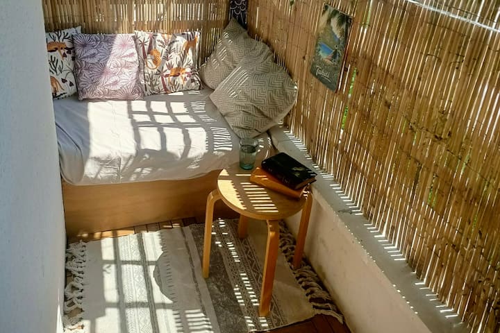 → חדר שינה: חדר שינה ראשי שקט עם מיטה זוגית נוחה מאוד בגודל 140x190 ושני מקומות אחסון גדולים לחפצים האישיים שלכם.