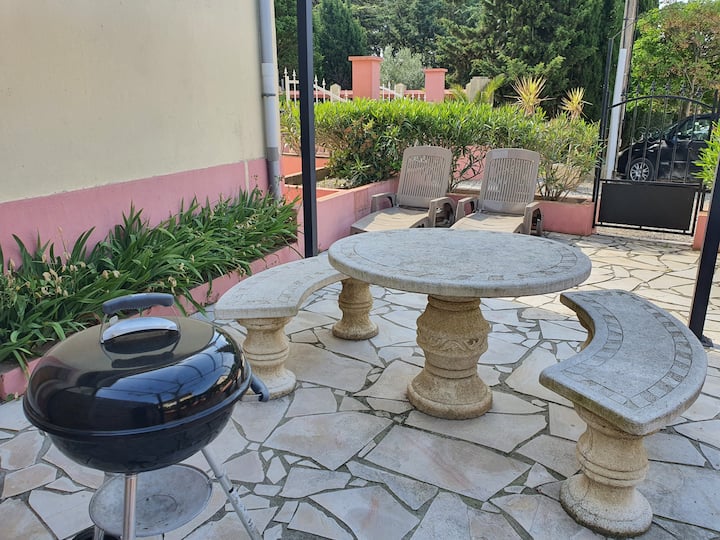 מרפסת פרטית, עם פרגולה, כיסאות נוח, ריהוט גן וברביקיו.