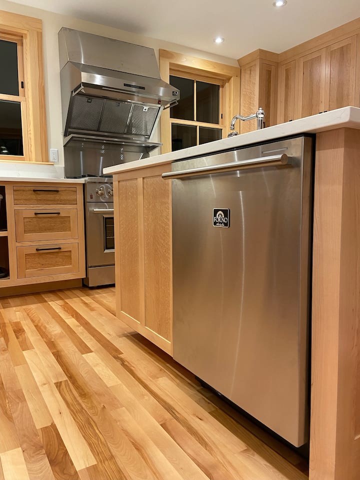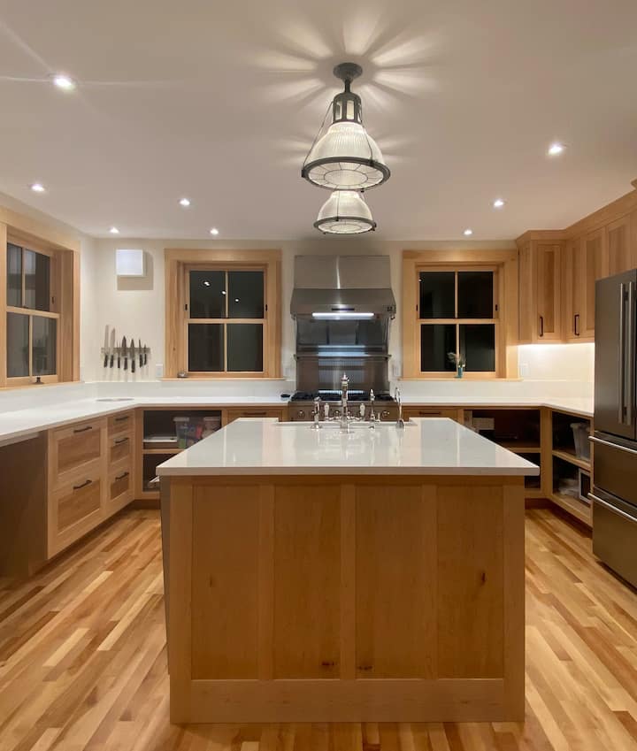 במטבח שלנו יש יותר אור טבעי ממה שאתם יכולים לדמיין ומספק מגע גורמה עם מכשירי פורנו בעיצוב איטלקי. ארונות מייפל של Birdseye שנוצרו בעבודת יד על ידי בנאי מקומי מציגים נגיעות אמנותיות ופרטים על גרגרי עץ שגורמים לכם להשהות ולהתפעל. כיור ה - Shaw האנגלי בעבודת יד בולט כקישוט המרכזי של האי, ואילו ברז המים האיטלקי מנצנץ מעל בביטחון נועז. דלפק השיש באורך 16 רגל ללא הפרעה מספק בר לקפה הבוקר שלכם ולנופים הרחוקים לווסט היל בשקיעה, או לאירוח מזנון לאורחים בארוחת הערב.