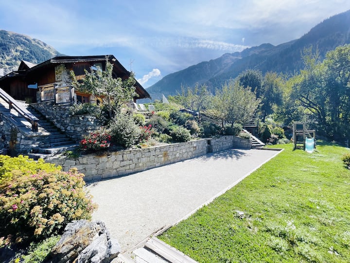 גינה חיצונית גדולה עם מנגל, מגרש פטנק, משחקי ילדים וסולריום.