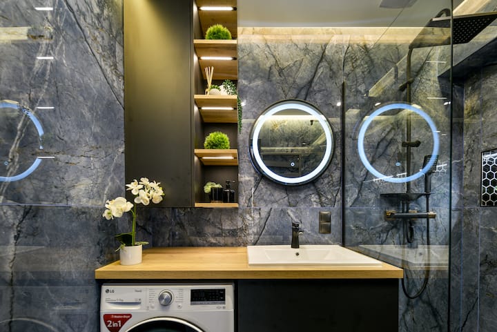 חדרי הרחצה מתפארים במקלחות בסגנון יערות הגשם כדי להצעיר את החושים. לנוחות נוספת, מכונת כביסה ומייבש זמינים גם בשני חדרי הרחצה, כדי להבטיח שתוכלו לנסוע קל וליהנות מהנוחות של בגדים מכובסים טריים במהלך השהייה שלכם.