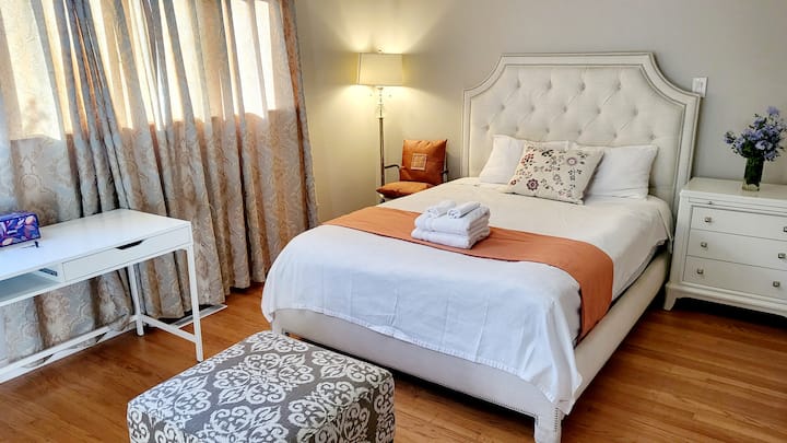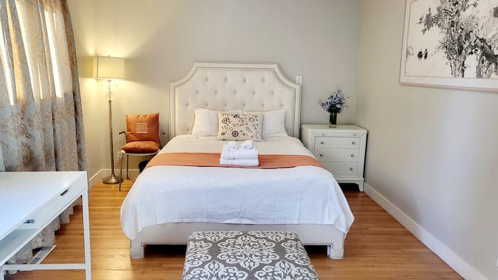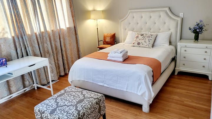 חדר שינה ראשי וחדר רחצה פרטי בבית יפה בחצר
