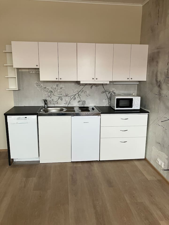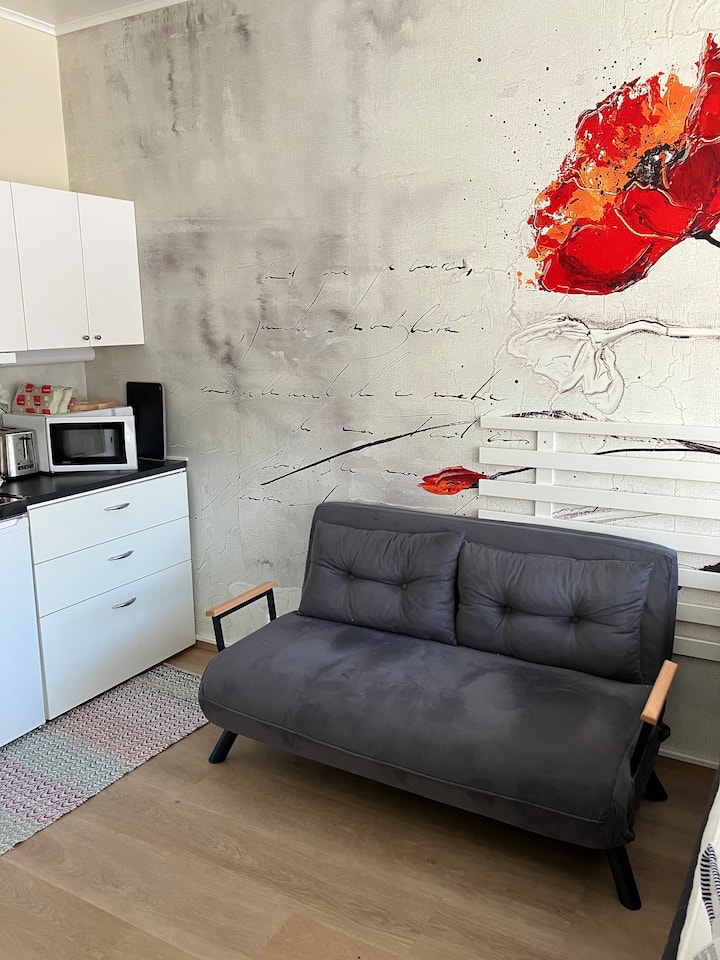 דירת סטודיו בקומת הקרקע לשניים, אפשר להחנות את המכונית ליד הדלת.