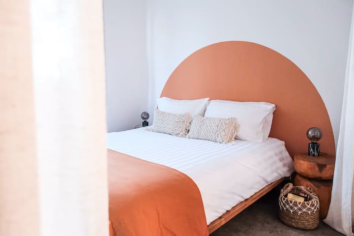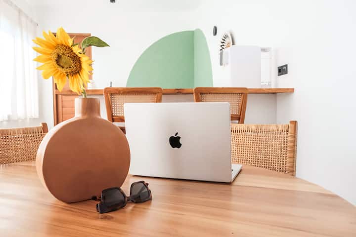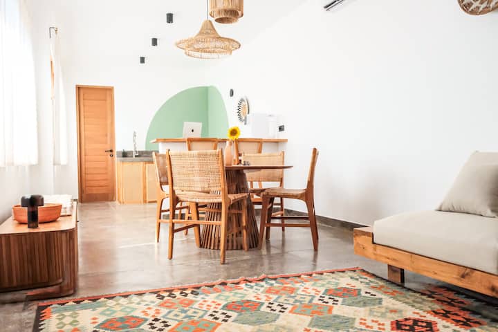 בית מעוצב שטוף שמש עם חדר שינה אחד ומרפסת