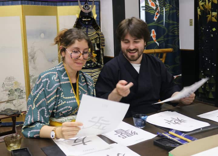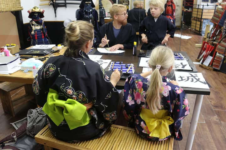 ללמוד זן של קליגרפיה בקימונו בטירת אוסקה