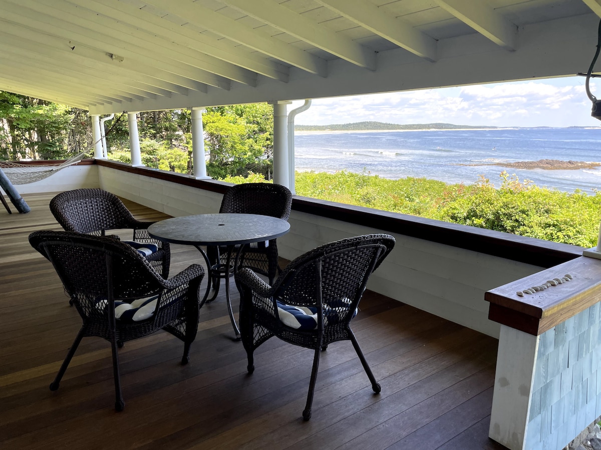 נכס קסום במיין עם שני מרפסות המשקיפות לים. עם שני דקים מקורים התלויים מעל קצה המים, ומדרגות מהמרפסת התחתונה המציעות גישה ישירה למים/לחוף הים. אזור ישיבה יפהפה ממוקם על הדק העליון, ומציע נוף פנורמי של המפרץ וחיות הבר בחוף. זריחות יפהפיות במיוחד, עם תצפיות תכופות של עיטם קירח, עיטם, וכלבי ים. חוויה אותנטית במיין!